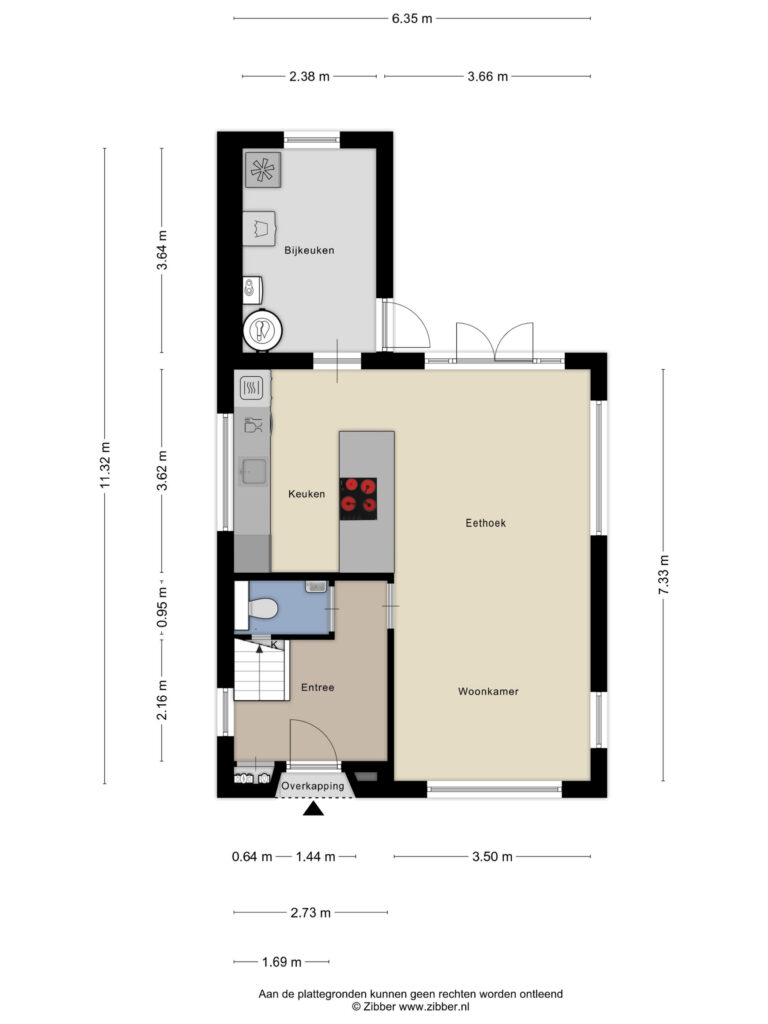 Hal met entree, meterkast, toiletruimte met wandcloset en fontein, en trapopgang naar de 1e verdieping; sfeervolle en lichte woonkamer met tuindeuren naar de achtertuin (ca. 7.35 x 3.50m); open keuken met luxe keukeninrichting met o.a. een kookeiland en voorzien van een Bora inductie kookplaat met ingebouwde afzuigkap, combi-oven, combi-stoomoven, koelkast en vaatwasmachine (ca. 3.60 x 2.85m); bijkeuken met toegang tot de tuin en opstelplaats van de was- en droogapparatuur en de warmtepomp (ca. 3.65 x 2.40m).
