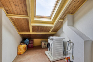 Via een vaste trap bereikbare voorzolder met dakraam en de opstelplaats voor de was- en droogapparatuur. De zolderkamer is voorzien van een dakraam aan de achterzijde.