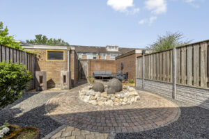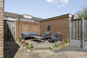 De diepe achtertuin is fraai aangelegd en gelegen op het zonnige westen. In deze tuin zijn twee terrassen met sierbestrating gecreëerd en borders met beplanting. Ook is er een waterornement aanwezig en een waterpunt. Achter in de tuin staat een stenen berging voorzien van elektra. De tuin is via een achterom te bereiken.