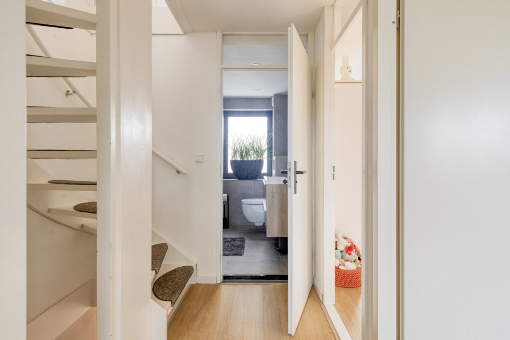Hal/entree met meterkast, de trapopgang naar de eerste verdieping en de moderne toiletruimte voorzien van een hangend closet. Vanuit de hal is er toegang tot de lichte woonkamer met trapkast met doorstroomapparaat, via een loopdeur is er toegang tot de tuin. De open keuken is gelegen aan de voorzijde en uitgevoerd met een inrichting in U-opstelling met granieten aanrechtblad en diverse onderkasten/laden. Aan inbouwapparatuur is aanwezig een combi-oven magnetron (2025), een inductie kookplaat (2025), een koelkast met vriesvak, een vaatwasser en een RVS afzuigkap. Vanuit de keuken is er een mooi vrij uitzicht over de groenvoorziening aan de voorzijde van de woning.