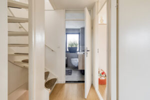 Overloop met de trapopgang naar de tweede verdieping en toegang tot 3 ruime slaapkamers en de badkamer. De slaapkamers zijn afgewerkt met een mooie laminaatvloeren en kunststof kozijnen met draai/kiep ramen.