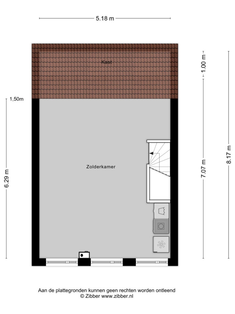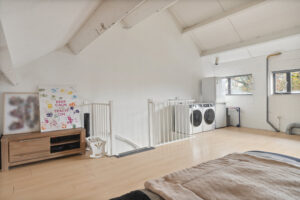 Open zolderruimte afgewerkt met een laminaatvloer en heeft diverse bergruimte achter de schuine kanten. Tevens bevinden zich hier de aansluitingen ten behoeve van de wasapparatuur. Deze ruimte is uitermate geschikt voor het creëren van twee afzonderlijke slaapkamers.