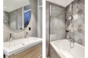 - De geheel betegelde, moderne badkamer (2022) is ingericht met een dubbele wastafel in meubel, spiegel, tweede toilet en een ligbad met douche en glazen spatscherm.