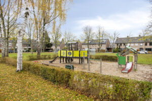 Entree/hal met toegang tot de trapopgang naar de eerste verdieping, meterkast, deels betegelde toiletruimte met hangend closet, vaste kast met bergruimte en extra opbergruimte onder de trap. Lichte en uitgebouwde living, voorzien van pleisterwerkwanden en een pvc-vloer. De living biedt voldoende ruimte voor het creëren van verschillende leefruimtes. Aan de voorzijde van de living bevindt zich een sfeervolle open haard. De woning is in 2000 aan de achterzijde uitgebouwd, waardoor er een fraaie ruimte is ontstaan die middels openslaande tuindeuren toegang biedt tot de achtertuin. In de uitbouw zijn tevens een lichtstraat en inbouwspots aanwezig. Op de vloer ligt Belgisch hardsteen met daaronder vloerverwarming. De keuken is aan de achterzijde van de woning gesitueerd en geplaatst in een hoekopstelling met een losse wandmodule. Aan inbouwapparatuur zijn aanwezig: 5-pits gaskookplaat, afzuigkap, vaatwasser, combi-oven, koelkast en vrieslades. Tevens is er veel opbergruimte aanwezig in de kasten en lades.