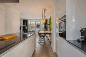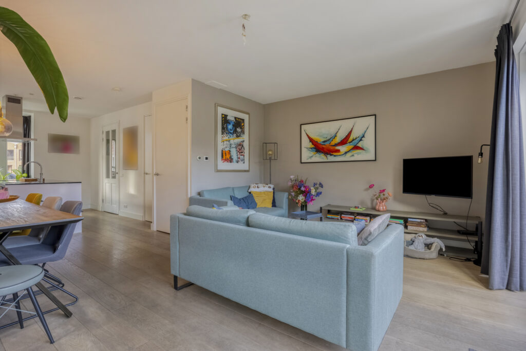 Middels een loopdeur is de living/keuken bereikbaar. Fraaie keuken gelegen aan de voorzijde van de woning. De keuken is voorzien van een groot kookeiland met composiet werkblad, als apparatuur is hier aanwezig; 4 pits inductiekookplaat, afzuigkap, Quooker, vaatwasmachine en veel opbergruimte in de kasten en lades, In de wandopstelling van de keuken is o.a. aanwezig; koelkast, vrieslades, combi-oven en tevens veel opbergruimte in de kasten en lades. Een leuk detail van deze woning zijn de erkers aan de voorzijde en zijkant van de woning. Aan aan achterzijde van de living is een ruime zithoek aanwezig met uitzicht op de tuin. Middels openslaande tuindeuren is de achtertuin bereikbaar. Tevens is er een praktische trapkast aanwezig met extra opbergruimte. Op de vloer van de gehele begane grond ligt een lamelparket met daaronder vloerverwarming en de wanden zijn afgewerkt met strak stucwerk.