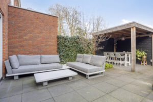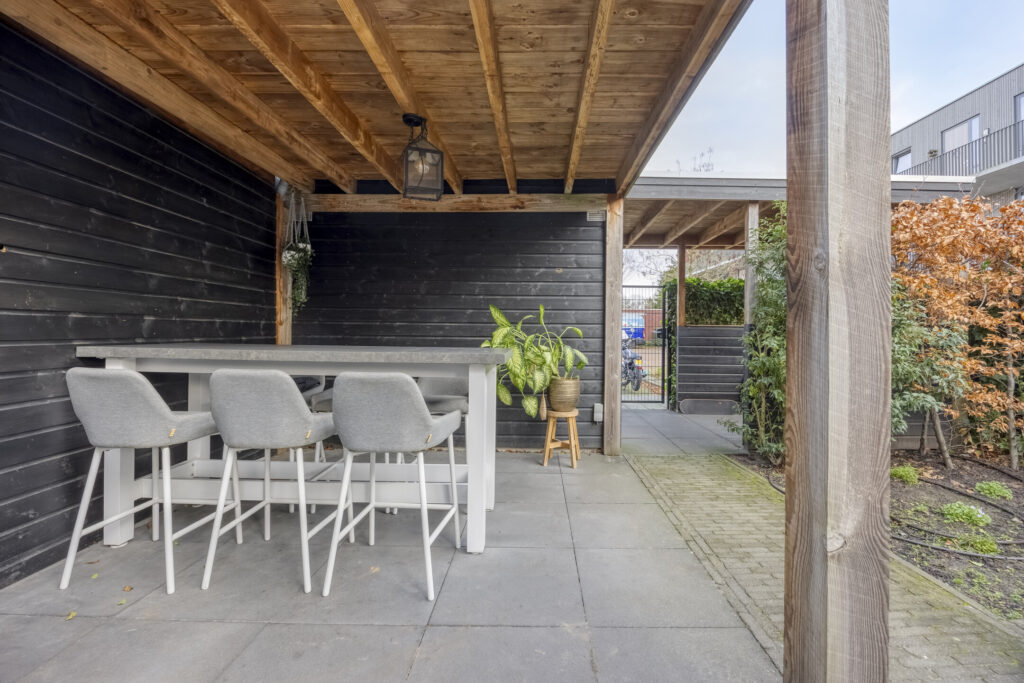 Fraai aangelegde achtertuin voorzien van een betegeld terras aan de woning, borders met beplanting. Aan de achterzijde van de tuin is een houtenoverkapping aanwezig hier kunt u heerlijk vertoeven. Tevens is er een houtenberging aanwezig alsmede een achterom die toegang biedt tot de parkeerplaats aan de achterzijde van de woning.