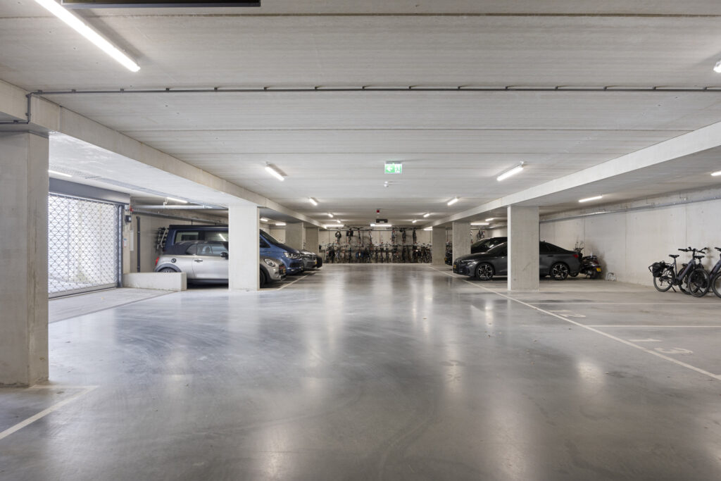 Voor de centrale entree is de ingang naar de parkeergarage gelegen, deze is voorzien van een elektrisch afgesloten poort.