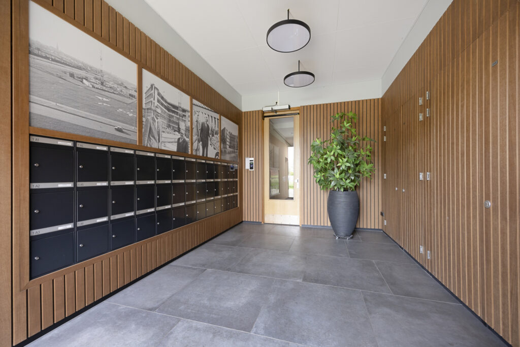 In de centrale entree van het appartementencomplex zijn de brievenbussen, het bellentableau en de intercominstallatie aanwezig. De centrale hal geeft toegang tot het trappenhuis en de lift naar de appartementen en de bergingen.