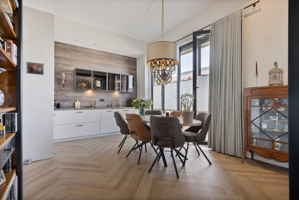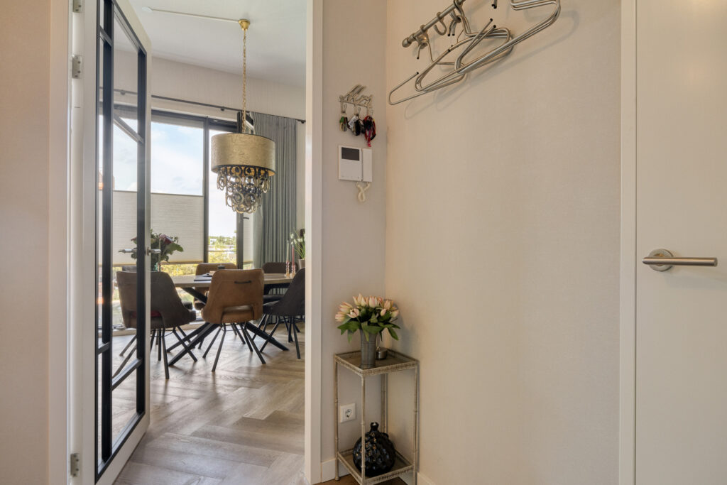 Via de entree van het appartement komt u in de hal (met video-intercominstallatie), die toegang geeft tot alle vertrekken van het appartement. Lichte en een gezellige eetkeuken voorzien van grote raampartijen, daardoor is er veel lichtinval. De keuken is opgesteld in een hoek en voorzien van de volgende inbouwapparatuur: Koelkast/vrieslades (Liebherr), grote combi-oven (Siemens), vaatwasmachine (Siemens), inductiekookplaat met ingebouwde afzuiging, onder en bovenkasten en lades met erg veel opbergruimte, een extra leuk detail zijn de glazen bovenkasten met inbouwverlichting.