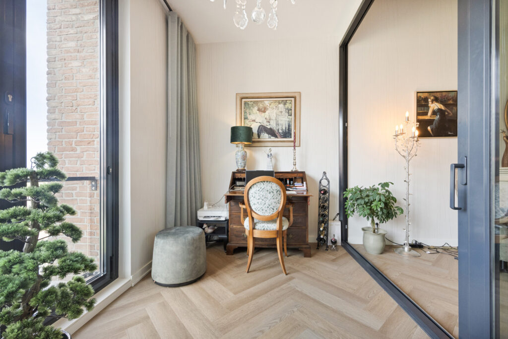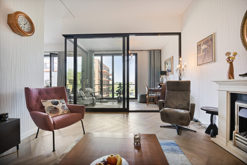 De eetkeuken staat in semi-open verbinding met de zitkamer. Hier heeft u voldoende ruimte om een sfeervolle zithoek te creëren. Middels een grote schuifpui is vanuit de zitkamer de lichte en ruime loggia bereikbaar. Deze ruimte kunt op op verschillende manier in gebruik nemen. Doormiddel van een grote harmonicadeur is het mogelijk om de glazen wanden in de loggia te openen, daardoor kun je optimaal genieten van het mooie weer en het uitzicht. De ruime en geheel betegelde badkamer (Villeroy & Boch) beschikt over een douche (met thermostaatkraan) en glazen schermen, wastafelmeubel met 2 kranen en een 2e hangend closet. Tevens is er een elektrische radiator aanwezig. Riante slaapkamer met walk-in-closet. Deze slaapkamer is op een eenvoudige manier om te bouwen naar 2 aparte slaapkamers. Door de grote raampartijen is er veel lichtinval, deze kunt u afsluiten met de handige Fractions raamdecoratie. Overige ruimtes: