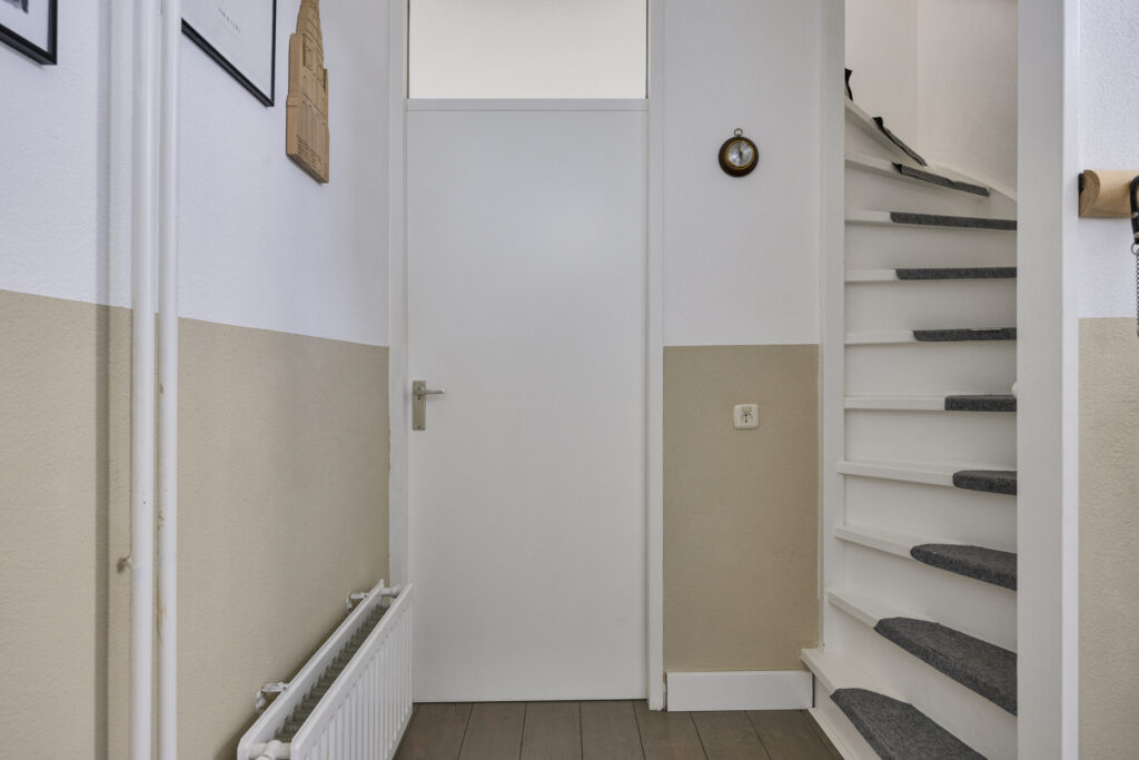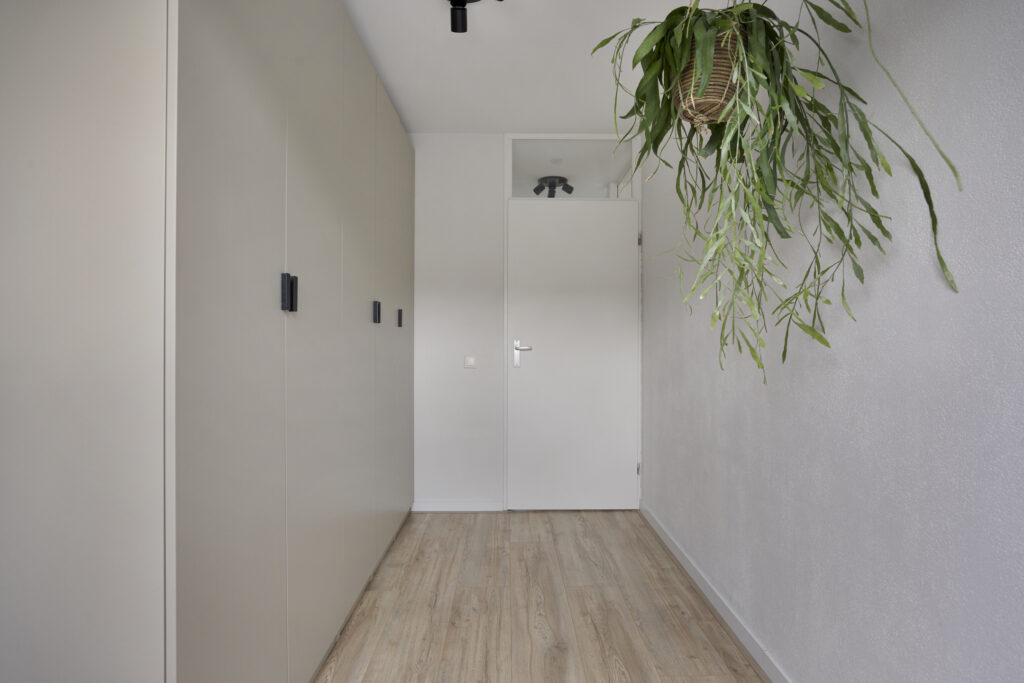 Entree met toegang tot de moderne meterkast, de kast met doorstroopapparaat stadverwarming, de trapopgang en toiletruimte (2024) voorzien van een hangcloset en een fonteintje. De ruime woonkamer heeft veel lichtinval en biedt toegang tot de tuin een loopdeur. Tussen de woonkamer en de keuken is een praktische trapkast gelegen. De open, luxe keuken (bj. 2021) is gelegen aan de voorzijde en uitgevoerd met een inrichting in hoekopstelling met diverse boven- en onderkasten. Aan inbouwapparatuur is aanwezig: inductie kookplaat, afzuigkap, vaatwasser, combi oven-magnetron, heteluchtoven, Quooker en koelkast.