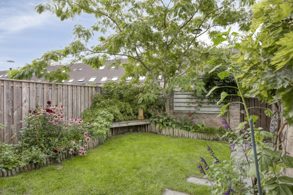 De woning heeft een verzorgde, privacy biedende achtertuin op het zuiden. De tuin beschikt over een terras, een gazon en diverse borders met vaste beplanting. Verder beschikt de tuin over degelijke erfafscheiding, diverse contacten en een handbedienbaar zonnescherm. Via een loopdeur is er toegang tot de garage.