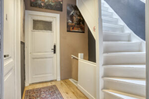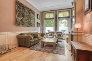 - De woning beschikt nog over diverse authentieke elementen zoals natuurstenen schouwen, hoge plafonds met sierlijsten, glas-in-lood ramen en dubbele 'en suite' deuren;