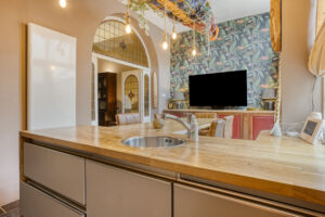 Sfeervolle en ruime living met schouw, hoge plafonds met sierlijsten, glas-in-lood bovenlichten en dubbele en-suite deuren naar woonkeuken. De living is ruim van opzet en biedt ruimte voor een gezellig zithoek bij de schouw met een fraai vrij uitzicht over de oude singel aan de voorzijde van de woning. Op de vloer van de living en het zitgedeelte van de keuken ligt laminaat en de wanden zijn deels voorzien van lambrisering deels stucwerk. Riante woonkeuken gelegen aan de achterzijde van de woning. Vanuit de woonkeuken heeft u middels openslaande deuren toegang tot de achtertuin. Keuken voorzien van een hardstenen blad, spoelbak, losse koelkast met vrieslades, oven, vaatwasser, 4-pits inductiekookplaat met inbouwde afzuiging. Vanuit de keuken heeft u toegang tot de kelder (ca. 3.00m x 3.00m) op stahoogte (1.80m), vaste kast met veel opbergruimte en de opstelplaats voor de CV-installatie, tevens is hier een douchruimte aanwezig. Aan de tuinzijde van de keuken is er toegang tot de ruime slaapkamer. Vanuit de slaapkamer heeft u middels een schuifpui tevens toegang tot de achtertuin. Vanuit de slaapkamer bereikt u de riante inpandige garage.