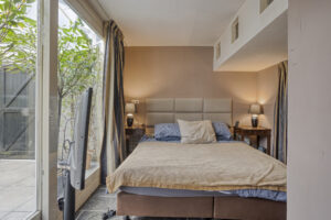 - Slaapkamer II gelegen aan de achterzijde. Deze slaapkamer is voorzien van een eigen moderne badkamer en kitchenette. In de badkamer treft u een douche, wastafelmeubel en een hangend closet. Middels openslaande deuren heeft u toegang tot het zonnige dakterras, deze is gesitueerd op het westen.