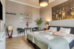 - Slaapkamer I gelegen aan de voorzijde van de woning met schouw, houtenvloer en openslaande deuren naar het balkon.