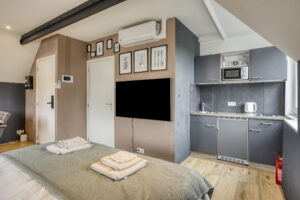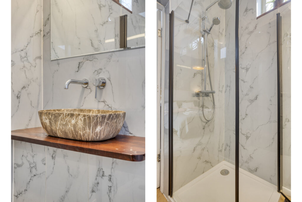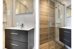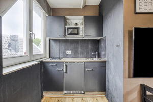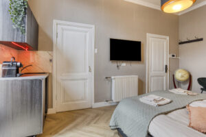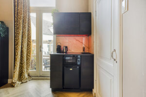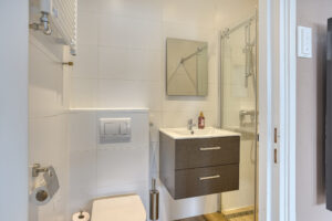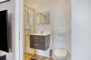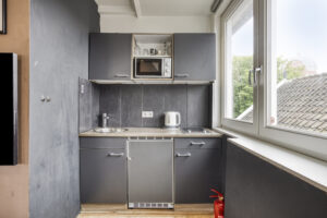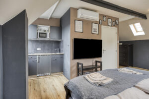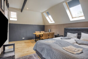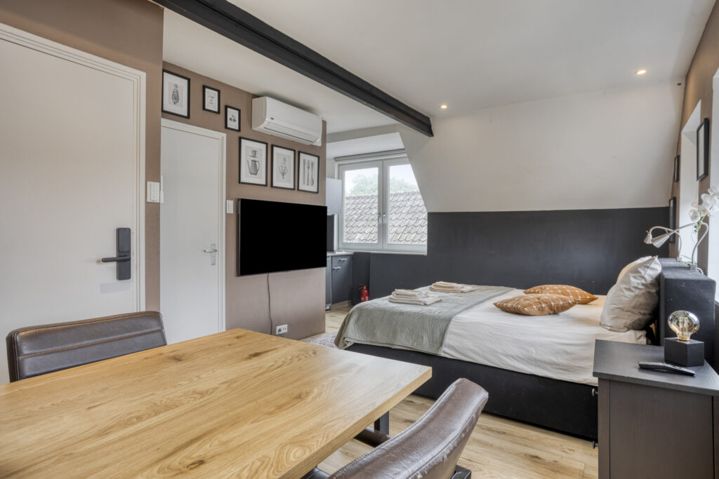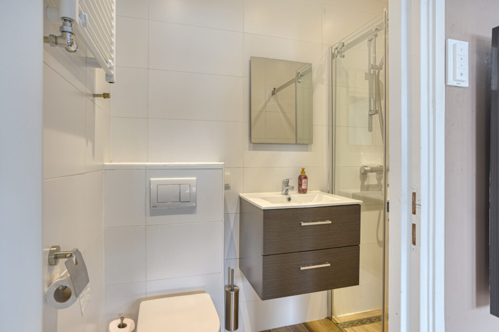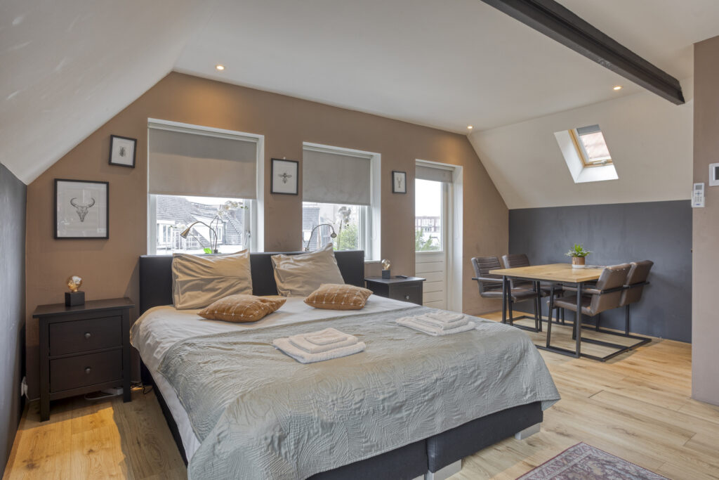- Slaapkamer III gelegen aan de achterzijde van de woning en voorzien van een eigen moderne badkamer en kitchenette. In de badkamer treft u een douche, wastafelmeubel en een hangend closet. Tevens is er airco en een dakraam aanwezig.