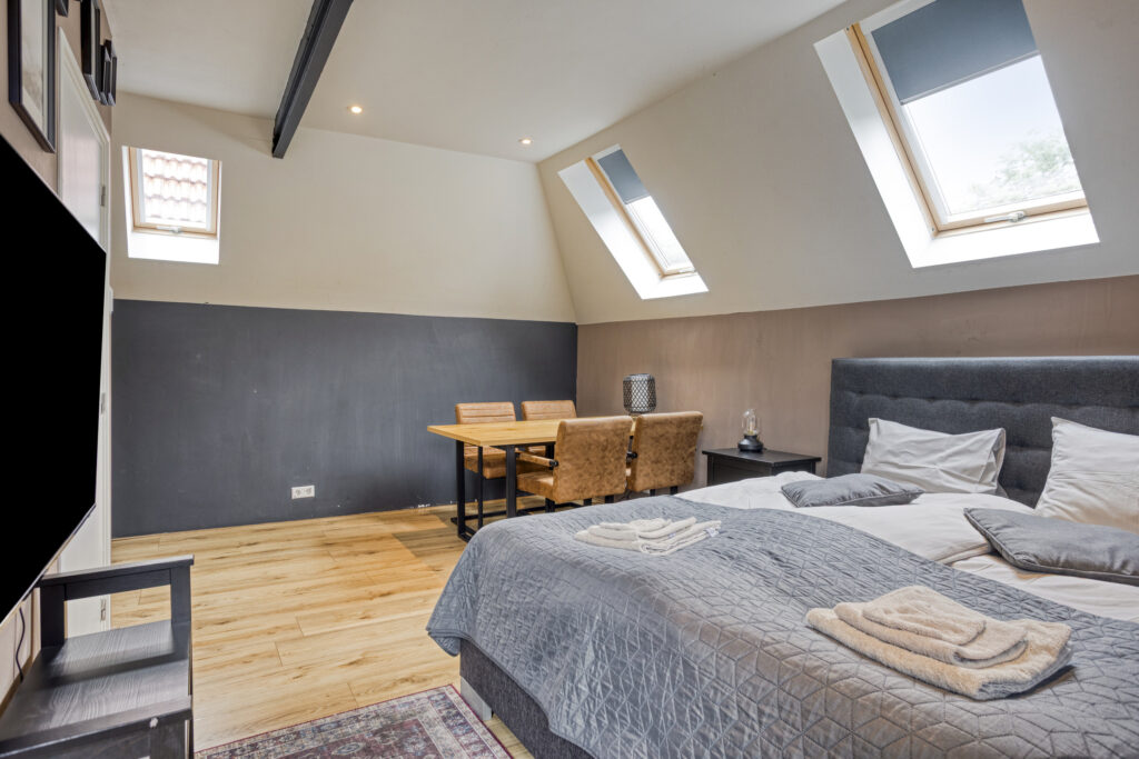 - Slaapkamer IV gelegen aan de voorzijde van de woning en voorzien van een eigen moderne badkamer en kitchenette. In de badkamer treft u een douche, wastafelmeubel en een hangend closet. Tevens is er airco en drie dakramen aanwezig. Middels een luik heeft u vanuit deze slaapkamer toegang tot de vliering met vel opbergruimte.