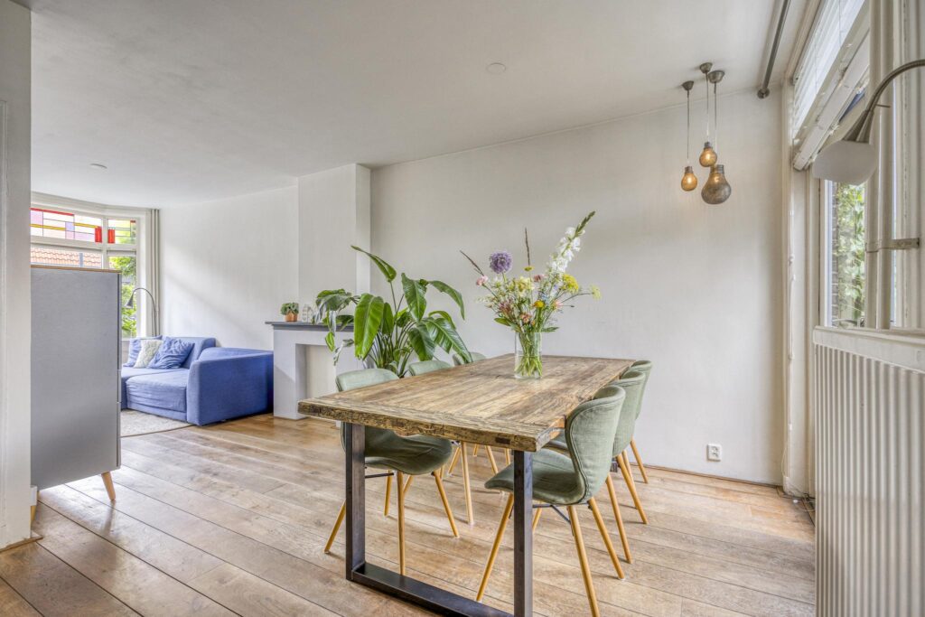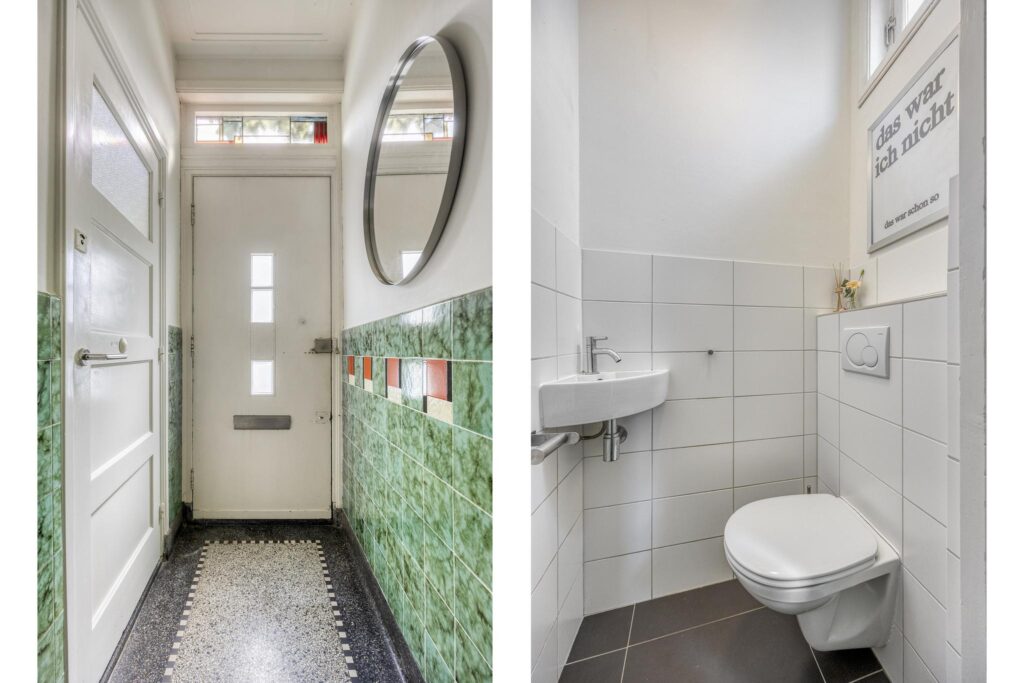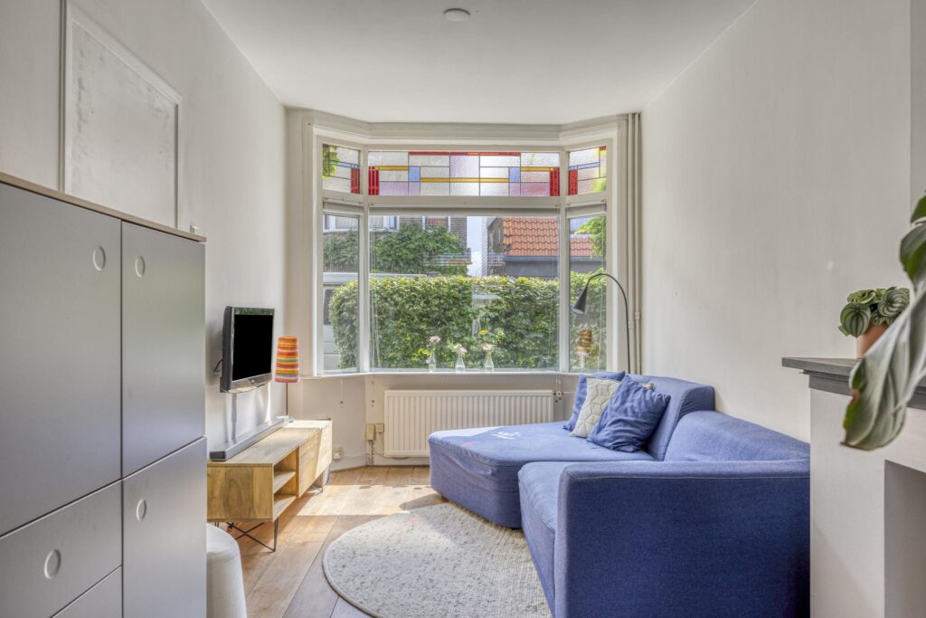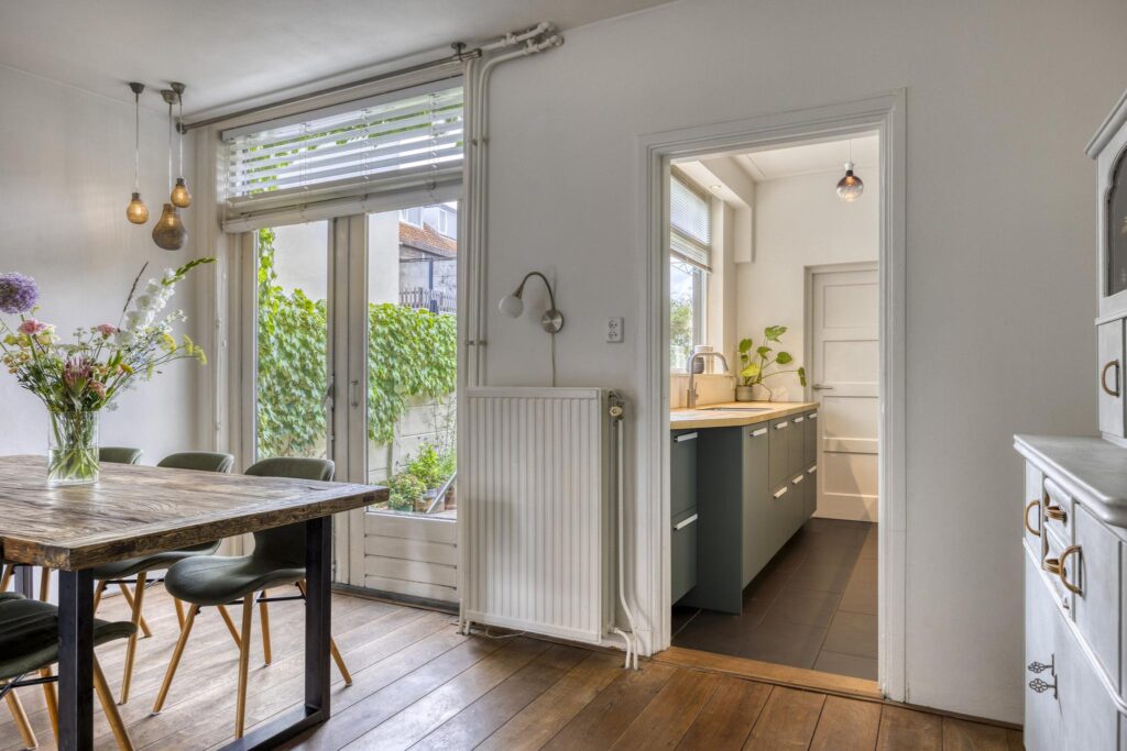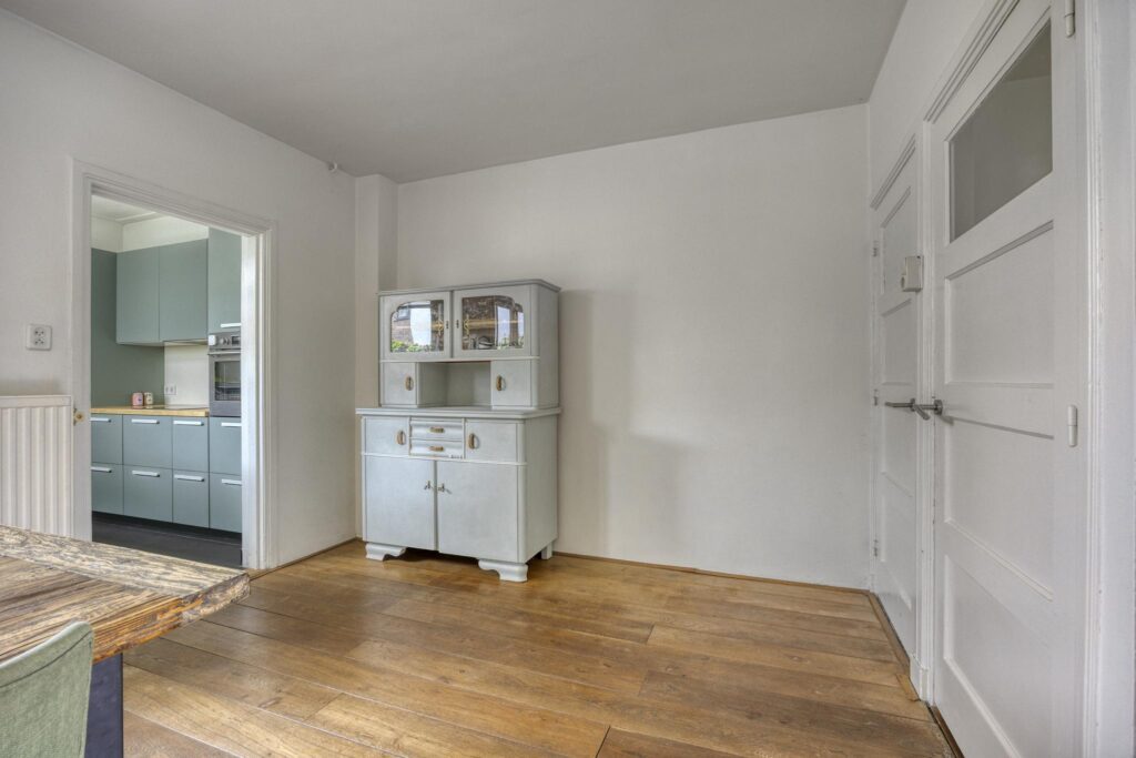 Entree, hal die toegang biedt tot de deels betegelde toiletruimte met hangend closet en fonteintje, trapopgang naar de eerste verdieping en de woonkamer. Leuke details zijn hier de originele tegeltjes en de terrazzo vloer! Sfeervolle woonkamer met houten vloer en pleisterwerk wanden en plafond. Middels openslaande deuren heeft u toegang tot de achtertuin. Een erker met originele glas-in-lood raampjes zorgt voor veel lichtinval en sfeer in de woonkamer. Vanuit de woonkamer is de kelderkast bereikbaar die veel opbergruimte biedt. De keuken is aan de achterzijde van de woning gelegen en in 2022 vernieuwd. De keuken heeft een rechte opstelling en beschikt o.a. over de volgende apparatuur: inductiekookplaat, afzuigkap (recirculatie), oven, koelkast, vrieslades, 1-1/2 spoelbak en een vaatwasmachine. Tevens is er veel opbergruimte in de kastjes en lades. Vanuit een groot raam is er zicht op de achtertuin. Op de vloer liggen tegels en de wanden zijn voorzien van stucwerk. Vanuit de keuken is de bijkeuken bereikbaar, hier treft u de aansluiting voor de was- en droogapparatuur. Tevens is hier de opstelplaats van de cv-ketel (Intergas bj. 2021) aanwezig. Middels een loopdeur heeft u toegang tot de achtertuin.