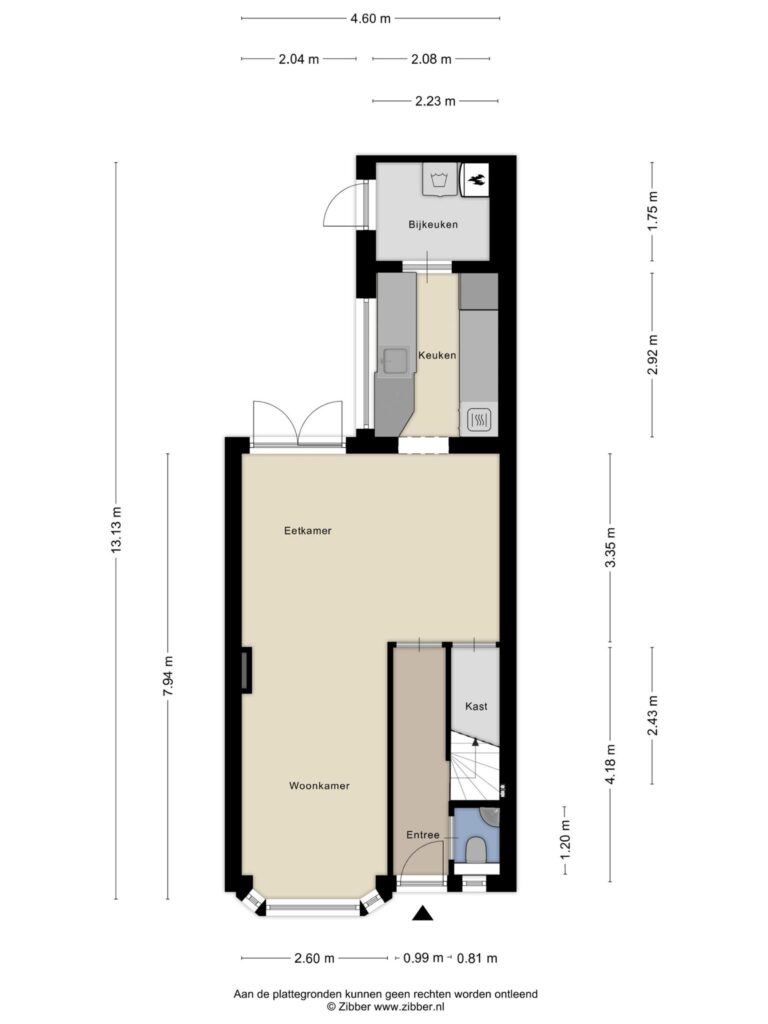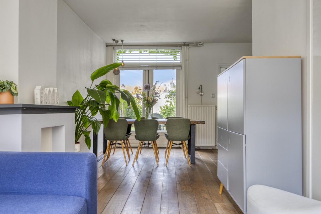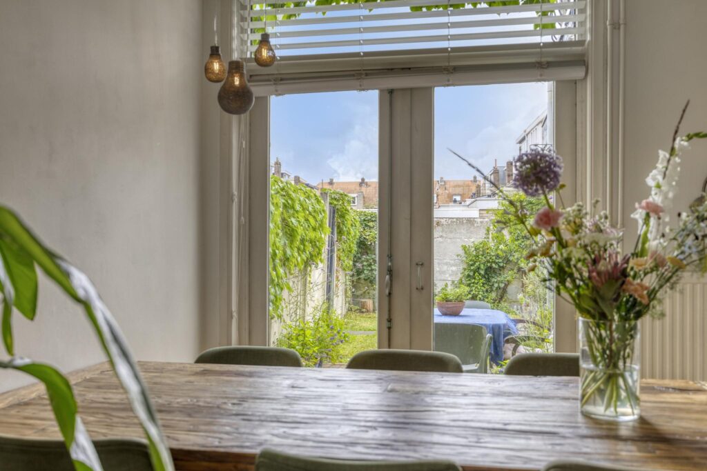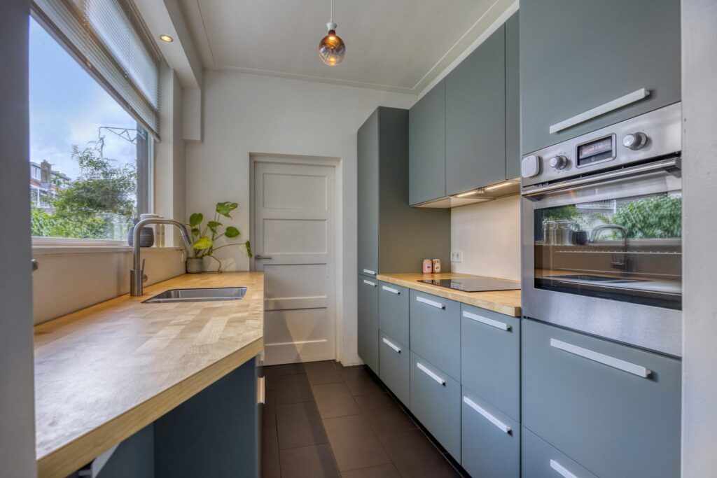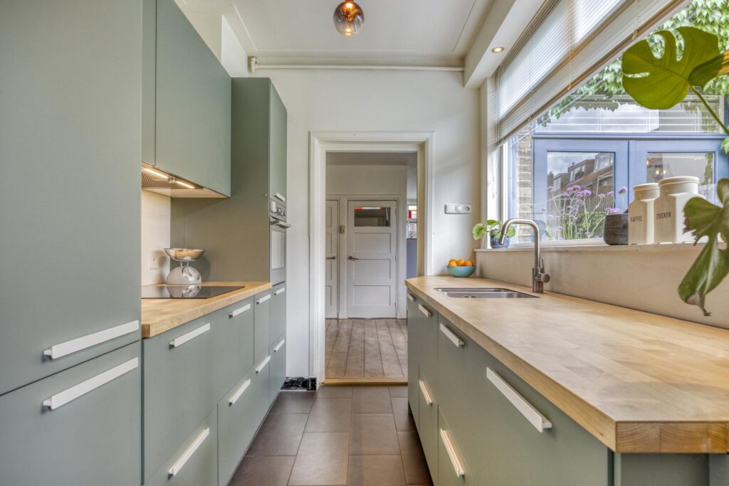 Entree, hal die toegang biedt tot de deels betegelde toiletruimte met hangend closet en fonteintje, trapopgang naar de eerste verdieping en de woonkamer. Leuke details zijn hier de originele tegeltjes en de terrazzo vloer! Sfeervolle woonkamer met houten vloer en pleisterwerk wanden en plafond. Middels openslaande deuren heeft u toegang tot de achtertuin. Een erker met originele glas-in-lood raampjes zorgt voor veel lichtinval en sfeer in de woonkamer. Vanuit de woonkamer is de kelderkast bereikbaar die veel opbergruimte biedt. De keuken is aan de achterzijde van de woning gelegen en in 2022 vernieuwd. De keuken heeft een rechte opstelling en beschikt o.a. over de volgende apparatuur: inductiekookplaat, afzuigkap (recirculatie), oven, koelkast, vrieslades, 1-1/2 spoelbak en een vaatwasmachine. Tevens is er veel opbergruimte in de kastjes en lades. Vanuit een groot raam is er zicht op de achtertuin. Op de vloer liggen tegels en de wanden zijn voorzien van stucwerk. Vanuit de keuken is de bijkeuken bereikbaar, hier treft u de aansluiting voor de was- en droogapparatuur. Tevens is hier de opstelplaats van de cv-ketel (Intergas bj. 2021) aanwezig. Middels een loopdeur heeft u toegang tot de achtertuin.