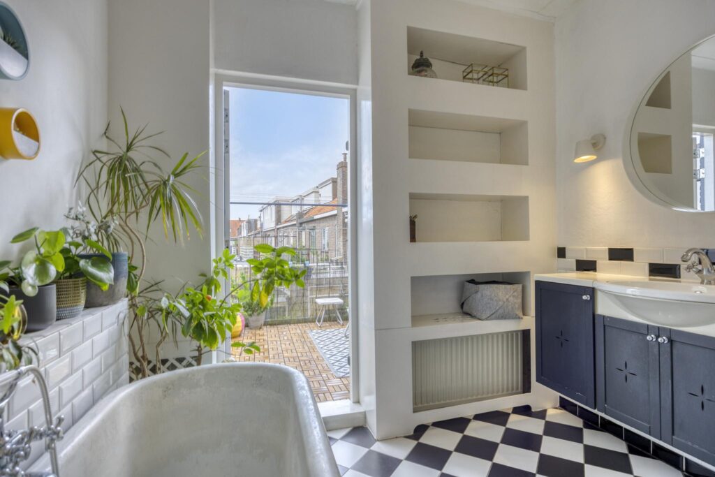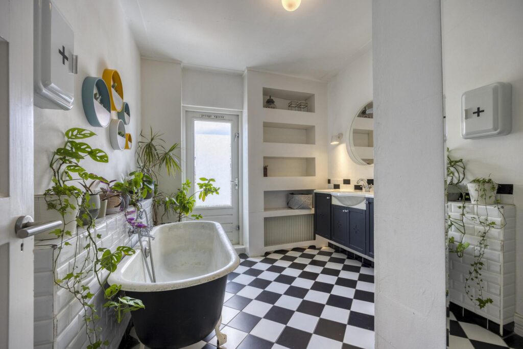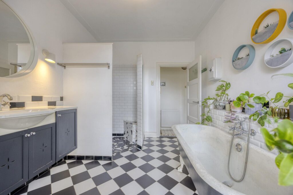 - Riante badkamer, gelegen aan de achterzijde van de woning, voorzien van een vrijstaand bad op pootjes, ruime inloopdouche en wastafelmeubel. De badkamer is deels betegeld. Middels een loopdeur heeft u toegang tot het gezellige en zonnige dakterras!
