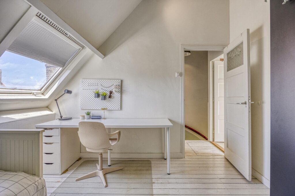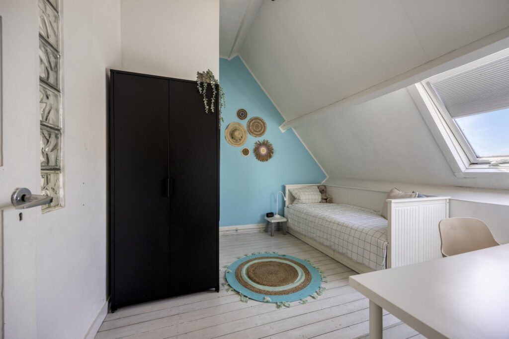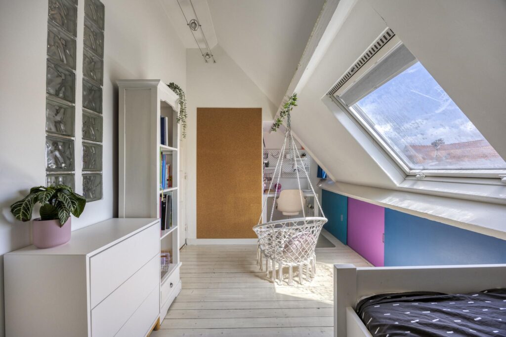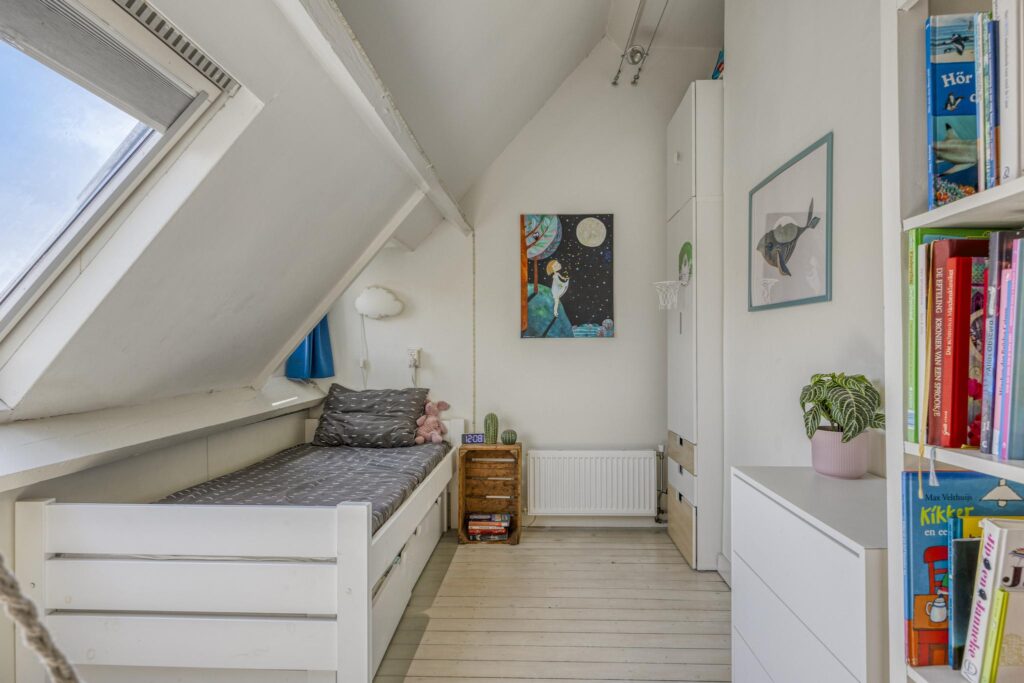 - Ruime slaapkamer gelegen aan de achterzijde van de woning met groot dakraam en veel bergruimte achter de knieschotten.