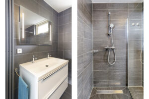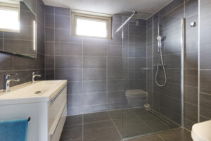- Geheel betegelde, moderne badkamer voorzien van; inloopdouche met glazen spatscherm, wandcloset, wastafel in meubel, spiegel met verlichting en handdoekenradiator. TWEEDE VERDIEPING