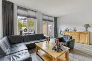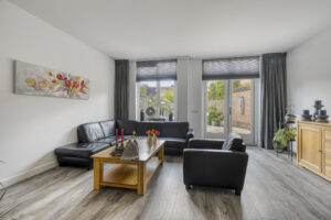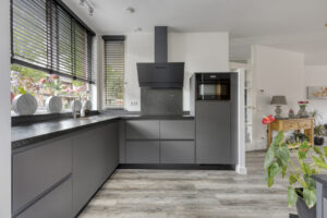 Entree met toegang tot de moderne meterkast, de ruime berg(trap)kast en toiletruimte voorzien van een hangcloset en een fonteintje in meubel. De ruime woonkamer heeft veel lichtinval en biedt toegang tot de tuin middels openslaande deuren. De halfopen, luxe keuken (bj. 2024) is gelegen aan de voorzijde en uitgevoerd met een hoogwaardige, antraciet keukeninrichting in hoekopstelling met natuurstenen aanrechtblad en diverse boven- en onderkasten. Aan inbouwapparatuur is aanwezig: inductie kookplaat, afzuigkap, vaatwasser, combi oven-magnetron en koelkast. In het verlengde van de keuken is er een extra keukenblad met aansluitingen wasapparatuur (weggewerkt d.m.v. schuifdeuren) en is er plaats voor eventueel een vriezer. Aan de andere zijde is nog één extra keukenblad geplaatst met extra kastruimte.