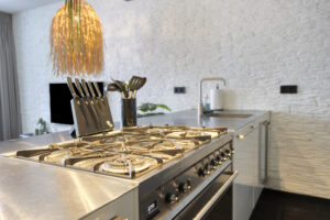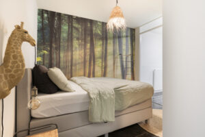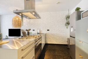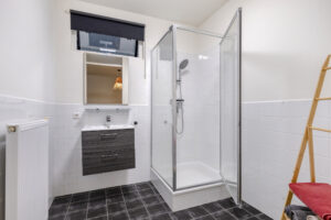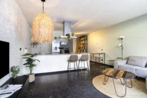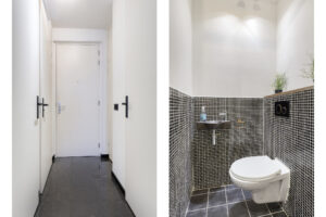 Hal-/entree voorzien van natuurstenen tegelvloer, vernieuwde meterkast (6 groepen en 2 aardlekschakelaars), toegang tot de stookruimte, wasruimte, toilet en living. Stookruimte met opstelplaats HR combiketel Remeha Avanta (2010). Wasruimte met aansluitingen ten behoeve van wasapparatuur. Toilet met zwevend toilet, fonteintje en mechanische ventilatie. Living voorzien van natuurstenen tegelvloer, open keuken, toegang tot de slaapkamer en loopdeur naar het ruime balkon. Moderne keuken voorzien van kookeiland met verzonken spoelbak, 6-pits gasfornuis met oven, recirculatieafzuigkap, vaatwasser en Amerikaanse koelkast. Slaapkamer met directe toegang tot de badkamer. Badkamer met wastafelmeubel, douchecabine en mechanische ventilatie.