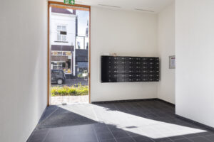 Statige centrale entree met bellentableau, brievenbussen en toegang tot trappenhuis, de lift de gezamenlijke fietsenberging, afvalruimte, parkeerkelder en de gemeenschappelijke binnentuin. De centrale entree en de parkeergarage zijn voorzien van camerabewaking.
