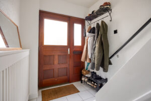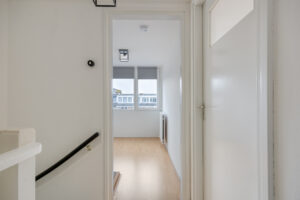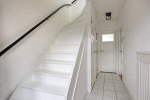 Overloop met vaste trapopgang naar de zolderverdieping en biedt toegang tot 2 slaapkamers, de separate toiletruimte, wasruimte en de badkamer.