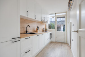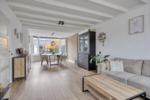 Hal/entree met trapkast, toiletruimte, meterkast (2025) en trapopgang naar de eerste verdieping. Vanuit de hal zijn de keuken en woonkamer toegankelijk. Dichte, vernieuwde keuken (2025), voorzien van een inductie kookplaat, een afzuigkap, een koel/vries combinatie, een vaatwasmachine en voldoende bergruimte in de boven- en onderkasten, via de keuken is er toegang tot de tuin. Uitgebouwde, lichte woonkamer (type doorzonkamer), voorzien van een laminaatvloer, aan zowel de voor- als achterzijde heeft deze woning grote raampartijen waardoor er veel natuurlijk licht binnen valt.