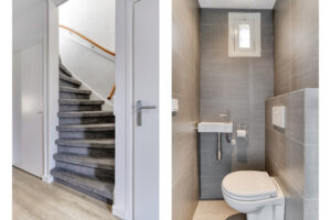Moderne toiletruimte met wandcloset, fonteintje en een uitzetraam.