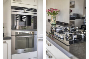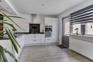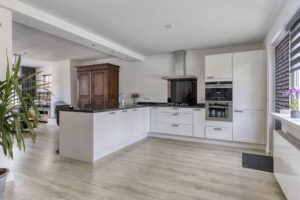 Royale eetkeuken (ca. 3.36m x 7.90m)met keukeninrichting in hoekopstelling met bargedeelte en een composiet aanrechtblad. Aan inbouwapparatuur is aanwezig: 4-pits gaskookplaat, afzuigkap, combi-magnetron/oven, koffiemachine, grote koelkast, vaatwasmachine en voldoende kastruimte. Vanuit de keuken is er toegang tot de tuin via een loopdeur.EERSTE VERDIEPING