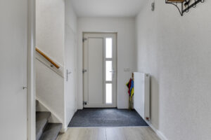 Entree in hal met laminaatvloer, trapopgang naar de eerste verdieping waaronder een verdiepte kelderkast met groepenkast.
