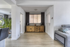 Royale L-woonkamer met laminaatvloer, sfeervolle inzethaard alsmede een open verbinding naar de eetkeuken. De woonkamer heeft veel natuurlijk lichtinval door de raampartijen langs 4-zijden.