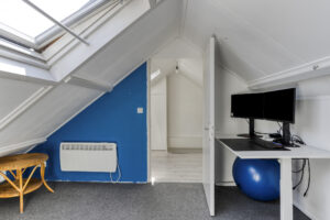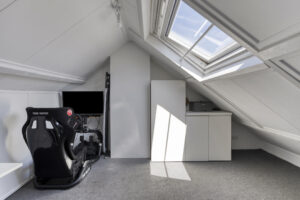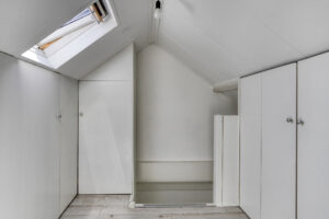 Slaapkamer met Velux dakvenster en bergruimte achter de schuine kant.