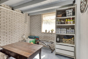 De garage gebouwd met spouwmuren en zadeldak is voorzien van elektra, betonvloer, wateraansluiting en een bergvliering onder de schuine kap. Tevens bevinden zich hier de aansluitingen ten behoeve van de wasapparatuur. In het achterste deel van de garage is een afzonderlijke ruimte/berging gecreëerd.
