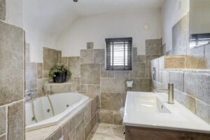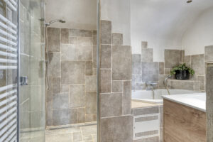- Nette badkamer voorzien van ligbad met Whirpool, inloopdouche met glazen deur, wastafelmeubel, wandcloset en designradiator.