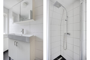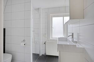 Ruime en volledig betegelde badkamer, gelegen aan de achterzijde van de woning, voorzien van een douche, hangend closet, wastafelmeubel en de aansluiting voor de was- en droogapparatuur. Een raam zorgt hier voor lichtinval en natuurlijke ventilatie.