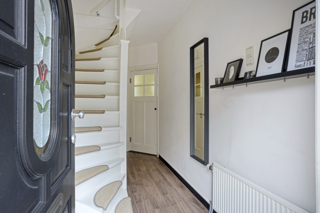 Entree/hal met toegang tot de garderobehoek; vernieuwde meterkast; trapopgang naar de eerste verdieping, voorzien van originele glas-in-lood raampartij, verdiepte trapkast met veel opbergruimte; Deels betegelde toiletruimte met staand closet en fonteintje een leuk detail in deze ruimte is het glas-in-lood raampje.