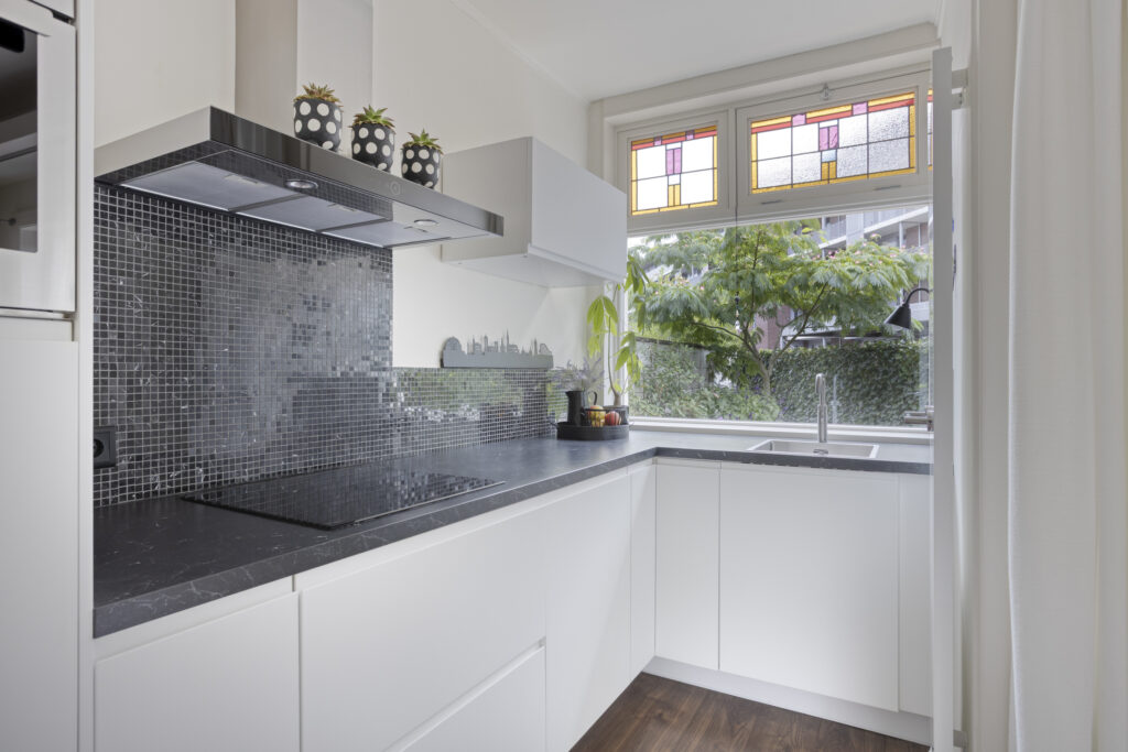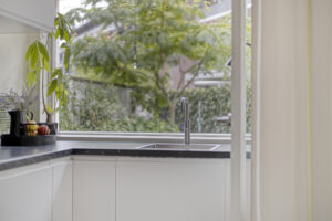 Moderne keuken (2019) geplaats in een hoek, door de grote raampartij heeft een een gezellig zicht in de tuin. Als apparatuur is hier aanwezig; 4-pits inductiekookplaat, afzuigkap, Quooker, combi-oven, koel/vriescombinatie en een vaatwasmachine tevens treft u veel opbergruimte aan in de kasten en lades.