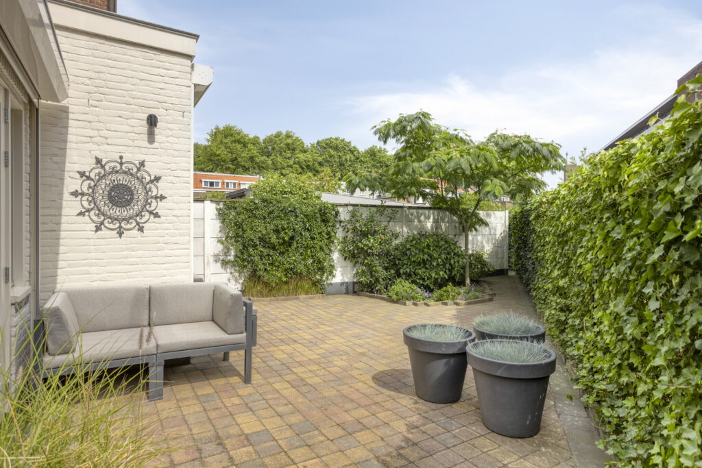 Gezellige en zonnige achtertuin welke makkelijk te onderhouden is, gesitueerd op het zuidoosten, voorzien van sierbestrating, buitenverlichting, kraantje en achterom. Tevens zijn er borders aanwezig met vaste beplanting en een schutting begroeid met Hedera. Riante berging gelegen aan de zijkant van de woning, deze is voorzien van elektra en veel opbergruimte, tevens voorzien van een 2e achterom. Voortuin met stenen/betonnen plantenbak en eenvoudig te onderhouden beplanting.