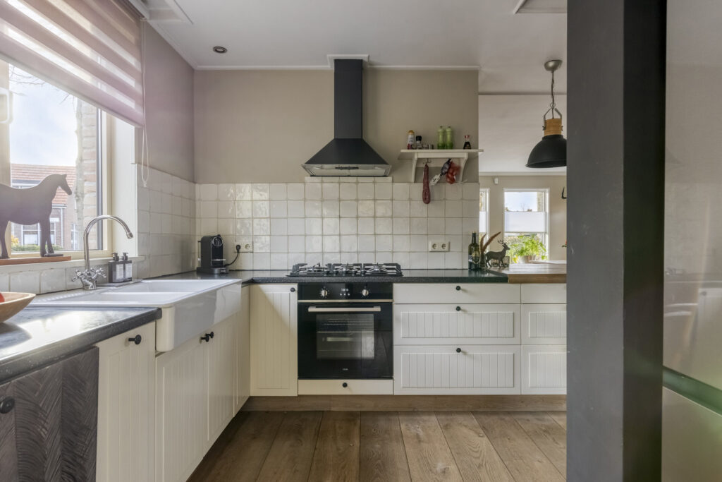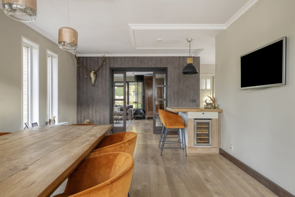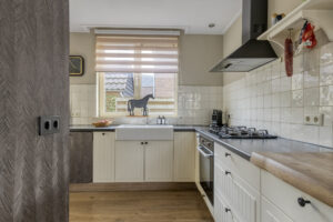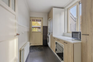 Via een duo voordeur met luifel betreed men de entree/hal met toegang tot de toiletruimte met hangend closet en fonteintje, leefkeuken, meterkast, garderobenis en vaste trap naar de verdieping. De royale leefkeuken heeft veel lichtinval door de grote raampartijen en biedt doorgang naar de woonkamer middels een tweetal schuifdeuren. De keuken in hoekopstelling is uitgerust met diverse boven- en onderkasten en is voorzien van diverse inbouwapparatuur: 5-pits gaskookplaat, heteluchtoven, afzuigkap, vaatwasser, koelkast (los) en wijnklimaatkast. De praktische bijkeuken is voorzien van een op maat gemaakte kastenwand met plaats voor o.a. de wasmachine en droger. Via een loopdeur is de achtertuin te bereiken. De tuingerichte, sfeervolle woonkamer met bio-ethanol haard is toegankelijk via een dubbele schuifdeur en kenmerkt zicht met vele en hoge raampartijen met vrij zicht op de tuin.