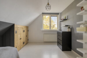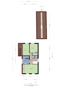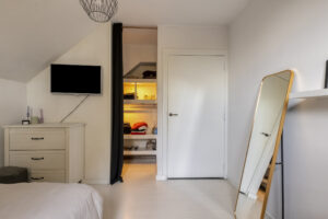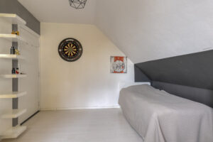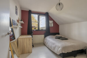 - Slaapkamer 3: (afm. 3.19 x 4.50m) eveneens gelegen aan de achterzijde en voorzien van een draai/kiep raam en een vaste steigerhouten kast onder de schuine kant;