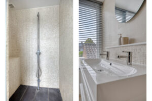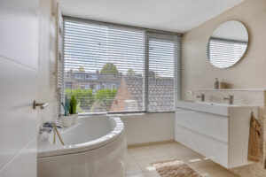 Overloop met toegang tot de twee slaapkamers en de badkamer; slaapkamer 1 (afm. ca. 3.41 x 3.49m) gelegen aan de voorzijde van de woning, slaapkamer 2 (afm. ca. 3.93 x 3.49m) gelegen aan de achterzijde van de woning; de derde kamer aan de voorzijde is voorzien van de trapopgang naar de tweede verdieping; de luxe en volledig betegelde badkamer (afm. ca. 3.96 x 2.44m) is gelegen aan de achterzijde en voorzien van een inloopdouche met regen- en handdouche, groot wastafelmeubel met dubbele kraan en tweede toilet. Tevens zijn er inbouwspots en mechanische ventilatie aanwezig. De vloeren op de overloop en de slaapkamers zijn afgewerkt met een laminaatvloer en stucwerk wandafwerking.