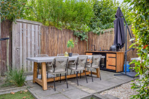 Fraai aangelegde voortuin voorzien van volwassen beplanting, waterkraan en oprit met ruimte voor 2 auto's. De onder architectuur aangelegde achtertuin is fraai ingericht en o.a. voorzien van meerdere terrassen, volwassen beplanting, overkapping, zonnescherm (doek vervangen in 2024), jacuzzi en een buitendouche met zonneboiler.