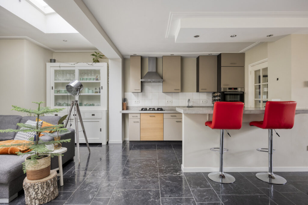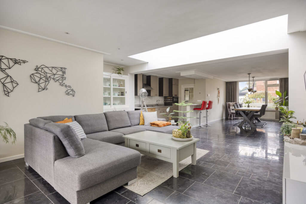De woning is traditioneel gebouwd en grotendeels voorzien van onderhoudsarme kozijnen (kunststof en aluminium) met HR++ beglazing en diverse draai/kiep ramen. De kozijnen aan de voorzijde zijn van hout. De meterkast (2015) is voorzien van ruim voldoende groepen en heeft een krachtgroep t.b.v. de elektrische auto. De warmwatervoorziening wordt aangestuurd middels een CV-combiketel (AWB bj. 2017). Qua isolatie is het pand voorzien van dakisolatie (uitbouw) alsmede muurisolatie (uitbouw). De woning is aan de achterzijde over de volle breedte uitgebouwd en voorzien van een lichtstraat voor extra natuurlijk inval. De begane grondvloer evenals de eerste verdiepingsvloer zijn uitgevoerd in beton, de tweede verdiepingsvloer betreft een houten vloerconstructie. De begane grond is geheel afgewerkt met een Chinese harstenen tegelvloer met vloerverwarming (m.u.v. toilet). De wanden evenals de plafonds op de begane grond zijn grotendeels voorzien van strak stucwerk. De overloop op de eerste verdieping evenals de slaapkamers zijn afgewerkt met laminaatvloeren. De garage is inpandig bereikbaar, volledig geïsoleerd en voorzien van vloerverwarming.