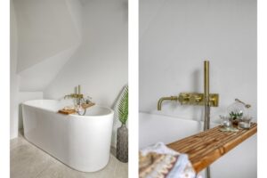 Overloop met trapopgang naar de 2e verdieping; riante slaapkamer (voorheen 2 slaapkamers) (ca. 6.80 x 3.05 / 2.35m) met vaste kast, deur naar het dakterras (5.65 x 2.20m); luxe badkamer (ca. 2.70 x 1.80 m) met vrijstaande ligbad, ruime inloopdouche en wastafelmeubel.