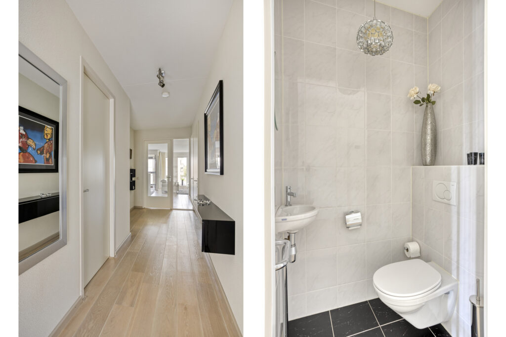 - Toilet, volledig betegeld en voorzien van een hangcloset, fonteintje en ventilatie;